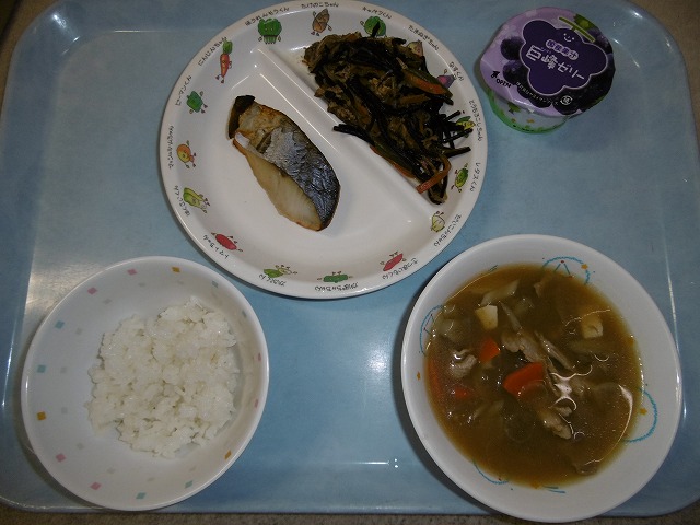 10月19日(金) ・ごはん ・さわらの照り焼き ・ひじきの煮物(ひじき・油揚げ・しらたき・にんじん・いんげん) ・豚汁(豚肉・大根・にんじん・ごぼう・豆腐・こんにゃく・ねぎ) ・ゼリー