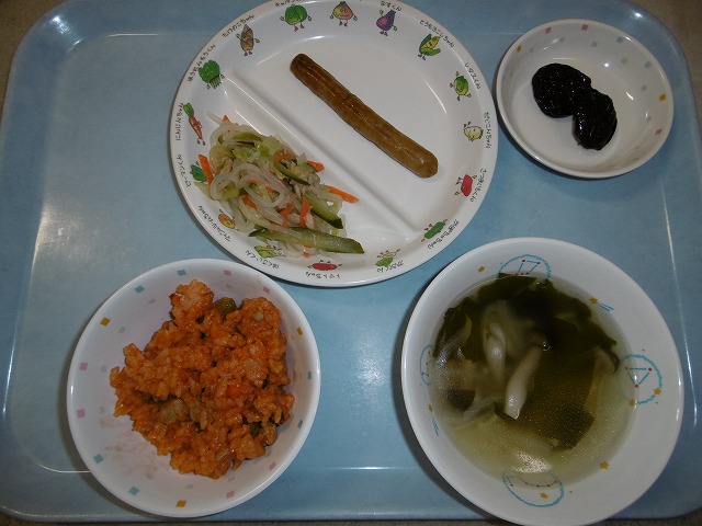 10月22日(月)給食 ・ケチャップライス(米・鶏肉・にんじん・コーン・玉ねぎ) ・ウインナー ・シルバーサラダ(マロニー・キャベツ・きゅうり・にんじん・ツナ) ・ABCスープ(マカロニ・玉ねぎ・しめじ・わかめ) ・プルーン