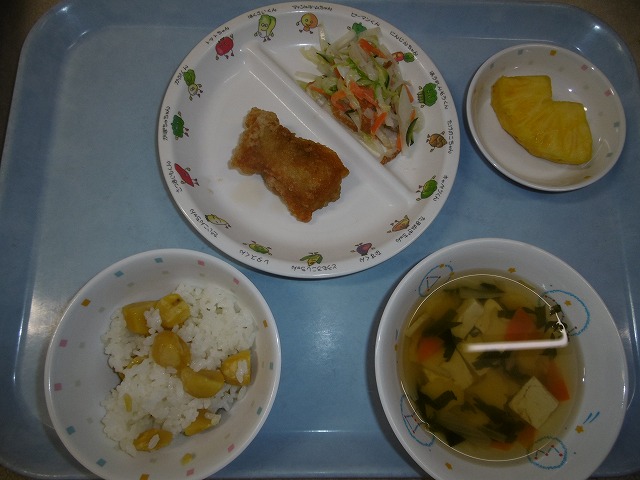 10月24日(水)給食 ・栗ごはん ・鶏肉のレモン風味(鶏肉・レモン汁) ・和風サラダ(大根・キャベツ・きゅうり・にんじん・ちくわ) ・すまし汁(豆腐・かまぼこ・玉ねぎ・にんじん・みつば) ・パイナップル
