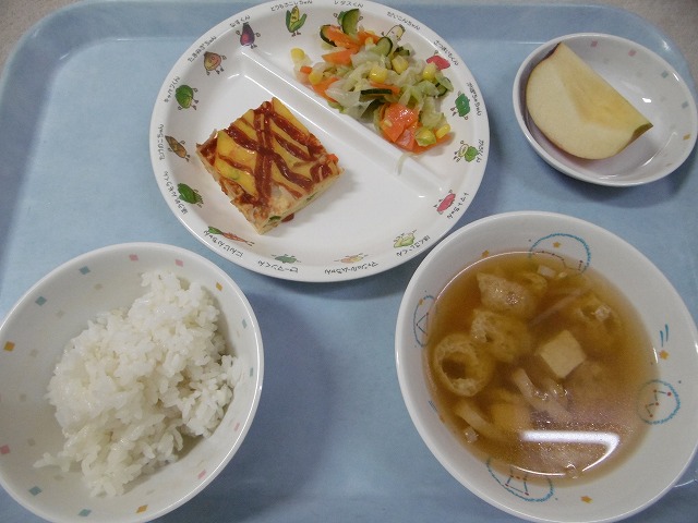 10月25日(金)給食 ・ごはん ・野菜入りオムレツ(卵・ベーコン・玉ねぎ・ピーマン・にんじん) ・フレンチサラダ(キャベツ・きゅうり・にんじん・コーン) ・みそ汁(豆腐・油揚げ・じゃがいも・ねぎ・みそ) ・りんご