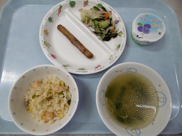 7月30日(月) 給食 ・シーフードチャーハン(米・えび・いか・玉ねぎ・ピーマン・にんじん・コーン) ・ウインナーソテー ・海藻サラダ(海藻・キャベツ・きゅうり・にんんじん・ハム) ・マカロニスープ(マカロニ・こまつな・玉ねぎ・もやし) ・ブルーベリーゼリー