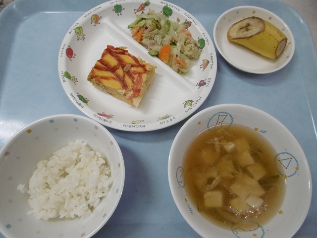 7月31日(火) 給食 ・ごはん ・スペイン風オムレツ(卵・ベーコン・じゃがいも・ピーマン・トマト) ・ツナサラダ(ツナ・キャベツ・きゅうり・にんじん) ・みそ汁(豆腐・油揚げ・しいたけ・ねぎ・みそ) ・バナナ