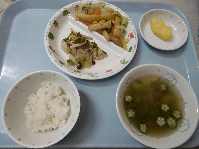 8月1日(水)給食 ・ごはん ・ささみのレモン煮 ・オクラの和え物(オクラ・キャベツ・にんじん・きゅうり・かつお節) ・すまし汁 (豆腐・かまぼこ・こまつな・ねぎ) ・オレンジ