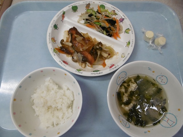 8月7日(火)給食 ・ごはん ・鮭のチャンチャン焼き(鮭・キャベツ・玉ねぎ・にんじん・しめじ・みそ) ・もやしのナムル(もやし・きゅうり・にんじん・わかめ) ・とうがん汁(とうがん・鶏挽き肉・こまつな・ねぎ) ・チーズ