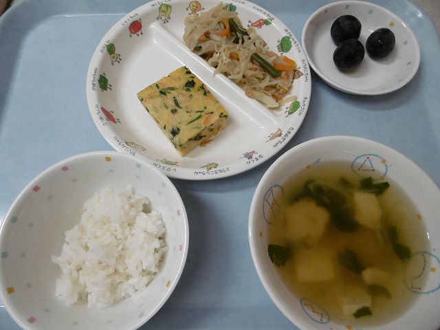 8月8日(水)給食 ・ごはん ・千草焼き(卵・ほうれん草・かにかま・にんじん・干ししいたけ) ・切干大根の煮物(切干大根・油揚げ・にんじん・ちくわ・いんげん) ・すまし汁(豆腐・ふ・玉ねぎ・みつば) ・きょほう