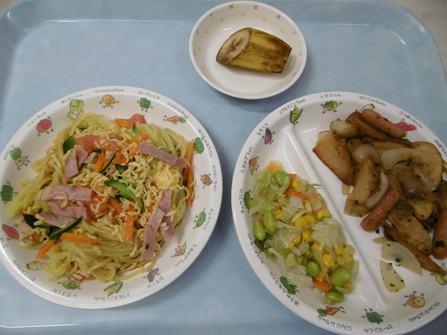 8月10日(金)給食 ・冷やし中華(麺・卵・ハム・きゅうり・にんじん・トマト) ・ジャーマンポテト(ポテト・ウインナー・玉ねぎ・パセリ) ・えだまめサラダ(キャベツ・えだまめ・にんじん・コーン) ・バナナ
