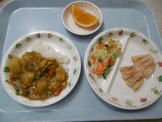 8月20日(月)給食 ・カレーライス(米・豚肉・じゃがいも・玉ねぎ・にんじん・ピーマン) ・フレンチサラダ(キャベツ・きゅうり・にんじん・コーン) ・えび揚げギョウザ ・オレンジ