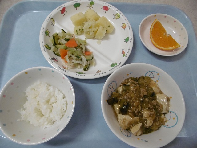 7月2日(月)給食 ・ごはん ・野菜たっぷりマーボー(豆腐・豚挽肉・玉ねぎ・なす・トマト・ピーマン) ・キャベツの香り漬け(キャベツ・きゅうり・にんじん・ごま) ・粉ふきいも(じゃがいも・パセリ) ・オレンジ