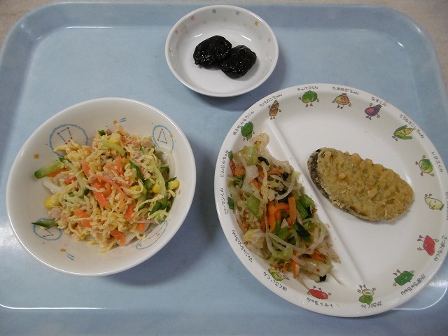 7月5日(木)給食 ・サラダうどん(うどん・ツナ・卵・きゅうり・にんじん・コーン) ・こまつなの和え物(こまつな・キャベツ・もやし・にんじん・かつお節) ・さつま芋の天ぷら ・プルーン