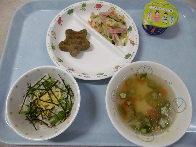 7月6日(金)給食 ・ちらし寿司(米・にんじん・竹の子・卵・しらす干し・えんどう) ・ハンバーグ ・シルバーサラダ(マロニー・ハム・キャベツ・きゅうり・にんじん) ・天の川スープ(オクラ・かまぼこ・玉ねぎ・にんじん・コーン) ・ゼリー