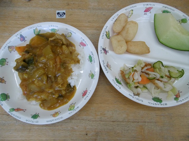 7月10日(火)給食 ・夏野菜カレー(米・豚肉・かぼちゃ・なす・玉ねぎ・にんじん・ピーマン・トマト) ・フレンチサラダ(キャベツ・きゅうり・にんじん・コーン) ・いかフリッター ・メロン