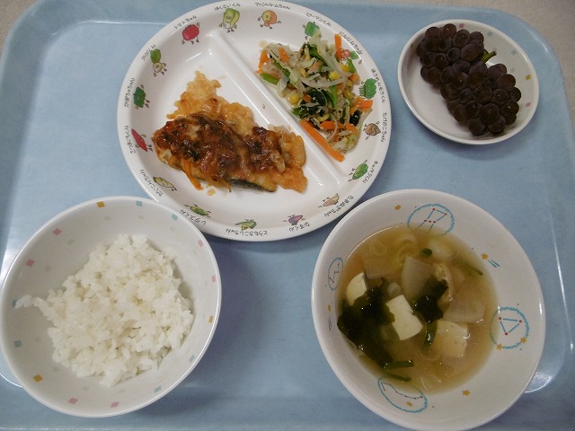 7月12日(木)給食 ・ごはん ・白身魚のピザ風焼き(メルルーサ・玉ねぎ・ピーマン・にんじん) ・ほうれん草ナムル(ほうれん草・キャベツ・もやし・にんじん・コーン・ごま) ・みそ汁(豆腐・油揚げ・だいこん・ねぎ・みそ) ・ぶどう