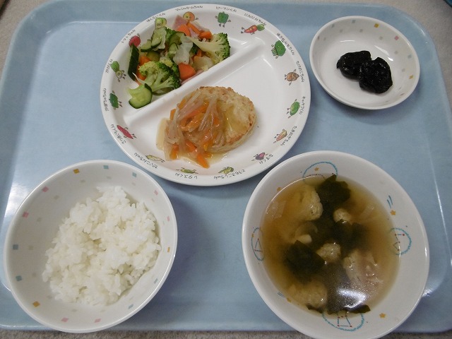 6月1日(金)給食 ・ごはん ・豆腐バーグの野菜あんかけ(豆腐バーグ・玉ねぎ・にんじん・もやし) ・ブロッコリーサラダ(ブロッコリー・キャベツ・きゅうり・にんじん・ハム) ・みそ汁(だいこん・油揚げ・しめじ・ねぎ・わかめ・みそ) ・プルーン