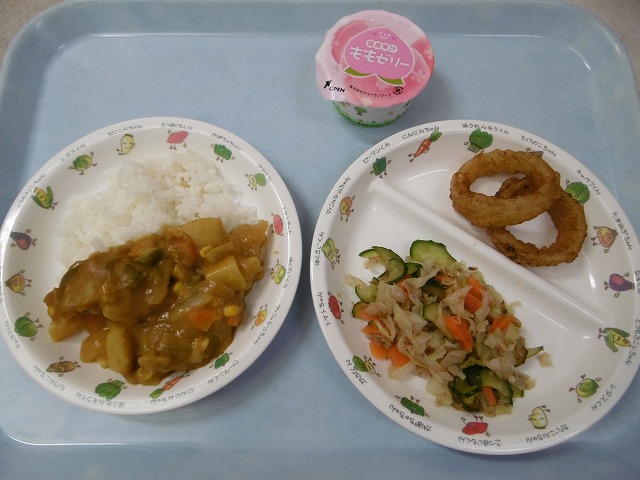 6月4日(月)給食 ・カレーライス(米・豚肉・じゃがいも・玉ねぎ・にんじん・ピーマン・コーン) ・キャベツのおかかあえ(キャベツ・きゅうり・にんじん・かつお節) ・オニオンリング ・ももゼリー