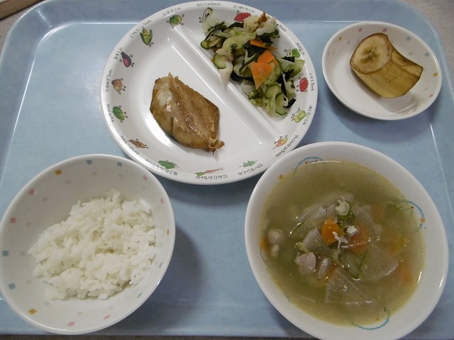 6月5日(火)給食 ・ごはん ・さばのごまだれかけ(さば・ごま) ・きゅうりの酢の物(きゅうり・キャベツ・にんじん・ちくわ・わかめ) ・けんちん汁(鶏肉・豆腐・油揚げ・だいこん・にんじん・ごぼう・ねぎ) ・バナナ