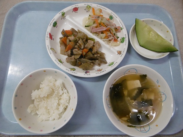 6月7日(木) ・ごはん ・筑前煮(鶏肉・ごぼう・れんこん・にんじん・こんにゃく・さやえんどう・干ししいたけ) ・はるさめサラダ(マロニー・ハム・キャベツ・きゅうり・にんじん) ・みそ汁(豆腐・油揚げ・玉ねぎ・えのきたけ・わかめ・みそ) ・メロン