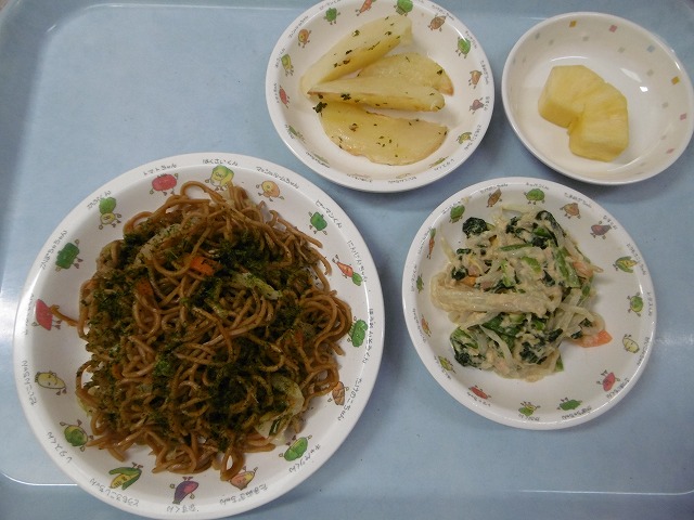6月8日(金)給食 ・焼きそば(麺・豚肉・キャベツ・玉ねぎ・にんじん・ピーマン) ・こまつなのカレー風味(こまつな・もやし・にんじん・ツナ) ・じゃがいものオーブン焼き(じゃがいも・パセリ・バター) ・パイナップル