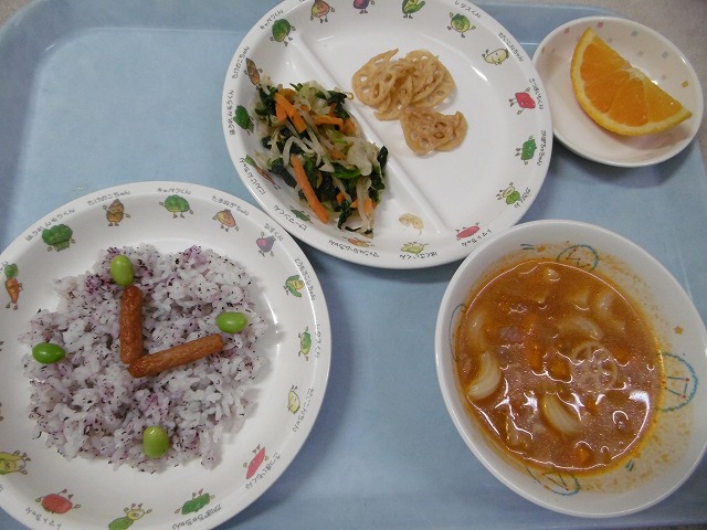 6月11日(月)給食 ・とけいごはん(米・ゆかり・ウインナー・えだまめ) ・おかかあえ(ほうれん草・キャベツ・にんじん・もやし・かつお節) ・れんこんチップス ・ミネストローネ(じゃがいも・ベーコン・玉ねぎ・にんじん・トマト・マカロニ) ・オレンジ