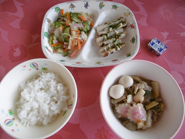 6月12日(火)給食 ・ごはん ・八宝菜(豚肉・えび・いか・なると・白菜・にんじん・玉ねぎ・たけのこ・うずら卵) ・中華あえ(キャベツ・きゅうり・にんじん・ハム) ・ちくわのマヨ焼き(ちくわ・マヨドレ) ・チーズ