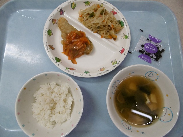 6月13日(水)給食 ・ごはん ・さわらの甘酢あん(さわら・玉ねぎ・にんじん・ケチャップ) ・切干大根の煮物(切干大根・油揚げ・ちくわ・にんじん・いんげん) ・ブルーベリー