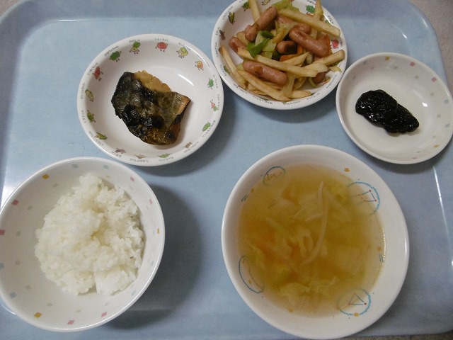 4月17日(火)給食&おやつ ・ごはん ・さわらの西京焼き ・いろどりソテー(ウインナー・キャベツ・玉ねぎ・ピーマン・にんじん・フライドポテト) ・白菜スープ(白菜・玉ねぎ・もやし・にんじん) ・プルーン おやつは、『ヨーグルトあえ』 みかん・パイン・もも・バナナ・レーズン・ヨーグルト