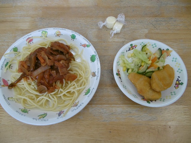 4月18日(水)給食 ・ナポリタンスパゲティ(スパゲティ・ベーコン・玉ねぎ・にんじん・ピーマン) ・フレンチサラダ(キャベツ・きゅうり・にんじん・コーン) ・チキンナゲット ・チーズ