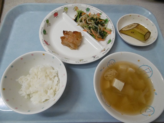 4月19日(木)給食&おやつ ・ごはん ・鶏肉の照り焼き ・ほうれん草のごまドレ(ほうれん草・キャベツ・もやし・にんじん・ごま) ・みそ汁(豆腐・油揚げ・じゃがいも・玉ねぎ・みそ) ・バナナ