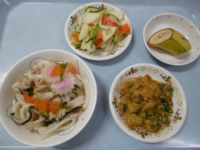 1月18日(木)給食 ・煮込みうどん(うどん・鶏肉・油揚げ・なると・にんじん・干ししいたけ・ねぎ) ・野菜かき揚げ(玉ねぎ・にんじん・ごぼう・しゅんぎく) ・白菜サラダ(はくさい・きゅうり・にんじん・かまぼこ・りんご) ・バナナ