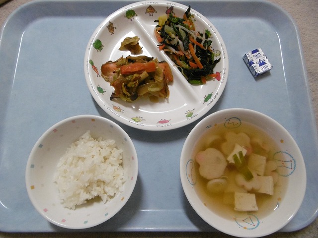 1月25日(木)給食&おやつ ・ごはん ・鮭のちゃんちゃん焼き(鮭・玉ねぎ・キャベツ・にんじん・しめじ・みそ) ・ほうれん草のおひたし(ほうれん草・はくさい・もやし・にんじん・かつお節) ・すまし汁(豆腐・油揚げ・かまぼこ・ねぎ) ・チーズ 〈おやつ〉 チョコタフィ:大豆、ココア、スキムミルク