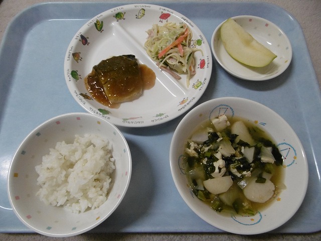 11月16日(木)給食 ・ごはん ・さばのみぞれ煮 ・サラスパサラダ(サラスパ・ハム・キャベツ・きゅうり・にんじん) ・みそ汁(豆腐・油揚げ・玉ねぎ・こまつな・みそ) ・りんご