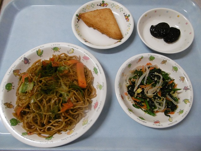 11月17日(金)給食 ・焼きそば(中華めん・豚肉・キャベツ・にんじん・玉ねぎ・ピーマン・青のり) ・もやしナムル(もやし・ほうれん草・にんじん・コーン) ・チーズはんぺんフライ ・プルーン