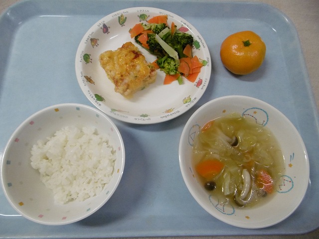 11月21日(火)給食 ・ごはん ・鮭のマヨネーズ焼き(鮭・玉ねぎ・マヨネーズ) ・ほうれん草のごまあえ(ほうれん草・キャベツ・にんじん・もやし・ごま) ・みそ汁(豆腐・油揚げ・だいこん・しいたけ・ねぎ・みそ) ・みかん