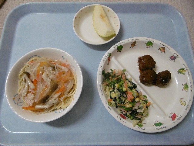 11月29日(水)給食 ・スープスパゲティ(スパゲティ・ベーコン・玉ネギ・にんじん・しめじ・えのきたけ) ・ほうれん草サラダ(ほうれん草・キャベツ・にんじん・コーン・ハム・マヨネーズ) ・ミートボールの甘煮 ・りんご