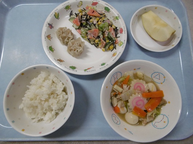 10月30日(月)給食 ・ごはん ・八宝菜(豚肉・いか・なると・にんじん・白菜・たけのこ・玉ねぎ・うずら卵・干ししいたけ) ・ひじきサラダ(ひじき・キャベツ・きゅうり・にんじん・ハム・コーン・マヨネーズ) ・蒸しシューマイ ・りんご