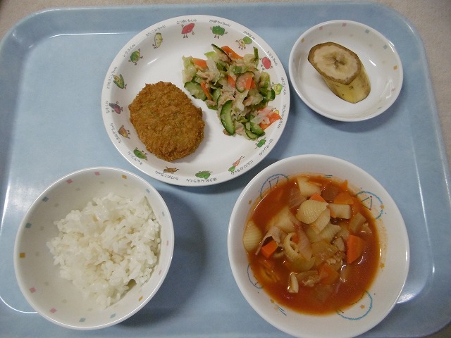 10月31日(火)給食 ・ごはん ・かぼちゃコロッケ ・ツナサラダ(ツナ・キャベツ・きゅうり・にんじん) ・ミネストローネ(マカロニ・ベーコン・玉ねぎ・じゃがいも・にんじん・トマト) ・バナナ