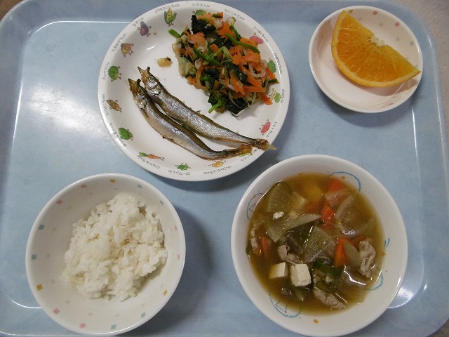 11月8日(水)給食 ・ごはん ・焼きししゃも ・ほうれん草のおひたし(ほうれん草・キャベツ・もやし・にんじん・かつお節) ・豚汁(豚肉・大根・にんじん・ごぼう・豆腐・こんにゃく・ねぎ) ・オレンジ