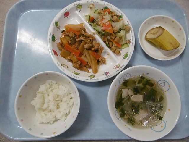 11月2日(木)給食 ・ごはん ・ささみのレモン煮(ささみ・レモン) ・キャベツのゆかりあえ(キャベツ・きゅうり・にんじん・ゆかり) ・五目汁(さといも・大根・にんじん・ごぼう・油揚げ・しめじ・ねぎ) ・りんご