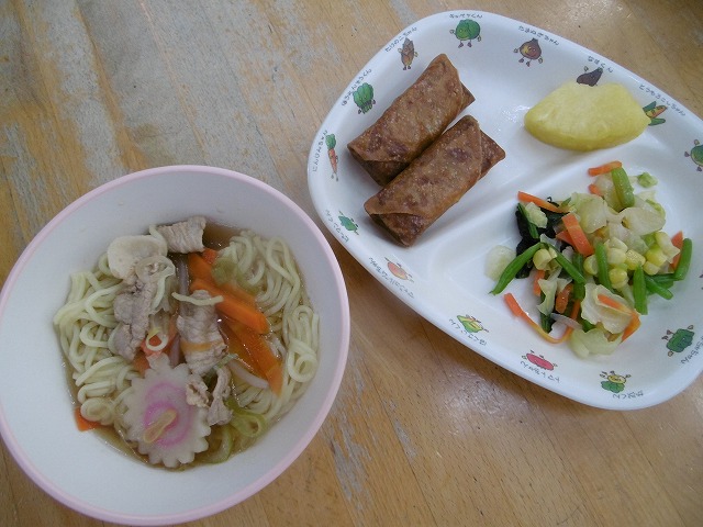 11月10日(金)給食 ・しょうゆラーメン(中華めん・豚肉・なると・もやし・にんじん・ねぎ・干ししいたけ) ・中華あえ(こまつな・キャベツ・にんじん・コーン) ・ミニはるまき ・パイナップル