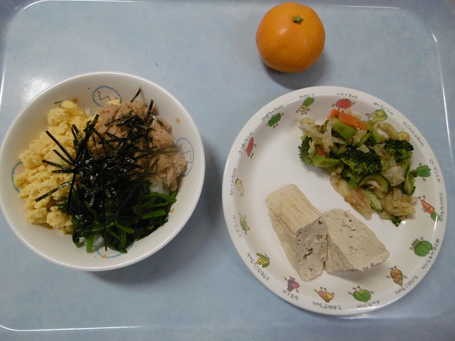 11月13日(月) 給食 ・三色どんぶり(米・ツナ・卵・ほうれん草・きざみのり) ・ブロッコリーのおかかあえ(ブロッコリー・キャベツ・きゅうり・にんじん・かつお節) ・こも豆腐の煮物 ・みかん