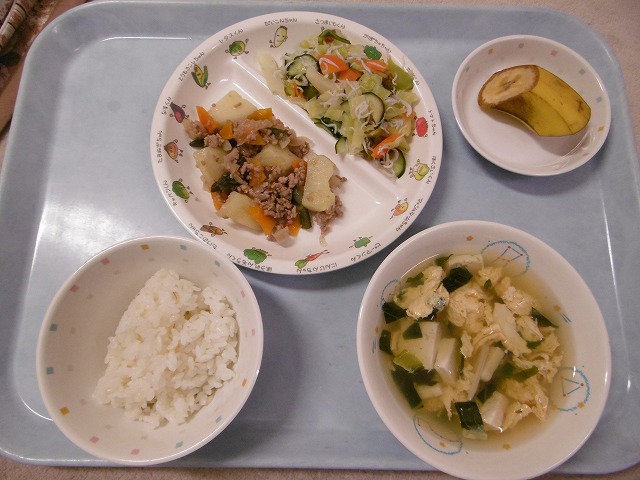 4月25日(火) 給食 ・ごはん ・じゃがいものそぼろ煮(じゃがいも・豚挽き肉・玉ねぎ・にんじん・いんげん) ・キャベツの甘酢あえ(キャベツ・きゅうり・にんじん・しらす干し) ・かきたま汁(卵・豆腐・えのきたけ・みつば) ・バナナ