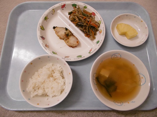 4月27日(木)給食 ・ごはん ・白身魚の香草焼き(メルルーサ・パセリ・オリーブ油) ・五目きんぴら(ごぼう・にんじん・油揚げ・いんげん・こんにゃく・ごま) ・みそ汁(豆腐・じゃがいも・玉ねぎ・しいたけ・わかめ) ・パイナップル