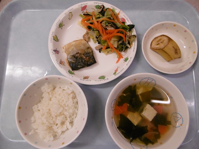 3月16日(木)給食 ・ごはん ・さばのみそ煮 ・ごもくあえ ・すまし汁 ・バナナ