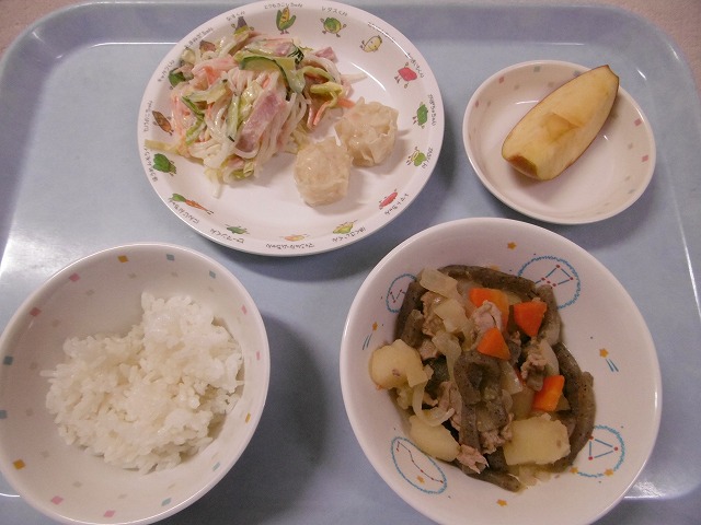 3月21日(火)給食 ・ごはん ・肉じゃが ・はるさめサラダ ・蒸しえびシューマイ ・りんご