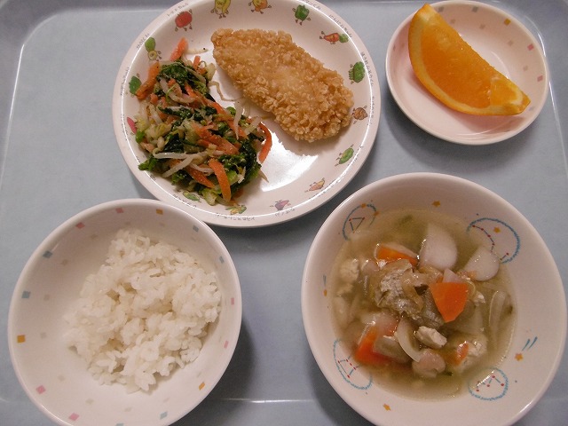 3月22日(水)給食 ・ごはん ・白身魚フライ ・ほうれん草ごまあえ ・けんちん汁 ・オレンジ