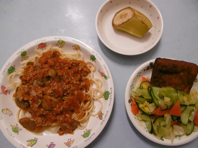3月23日(木)給食 ・ミートスパゲティ ・かぼちゃと蓮根の豆腐揚げ ・フレンチサラダ ・バナナ