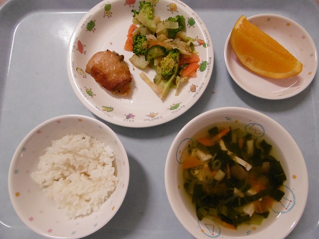4月6日(木) 給食 ・ごはん ・鶏肉の香味焼き ・ブロッコリーおかかあえ(ブロッコリー・キャベツ・きゅうり・にんじん・かつお節) ・すまし汁(豆腐・しめじ・こまつな・にんじん・ねぎ) ・オレンジ
