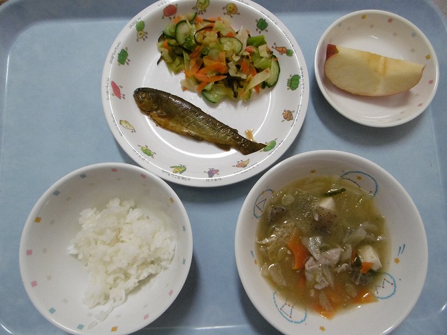 2月27日(月)給食 ・ごはん ・にじますの甘露煮 ・きゅうりの塩昆布あえ ・豚汁 ・りんご