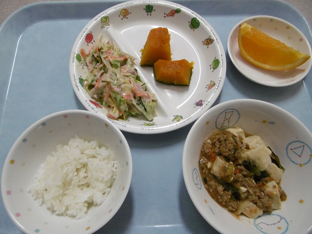 2月28日(火)給食 ・ごはん ・マーボ豆腐 ・ごぼうサラダ ・かぼちゃの甘煮 ・オレンジ