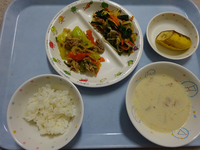 3月2日(木)給食 ・ごはん ・豚肉のみそ炒め ・ほうれん草おひたし ・豆乳スープ ・バナナ