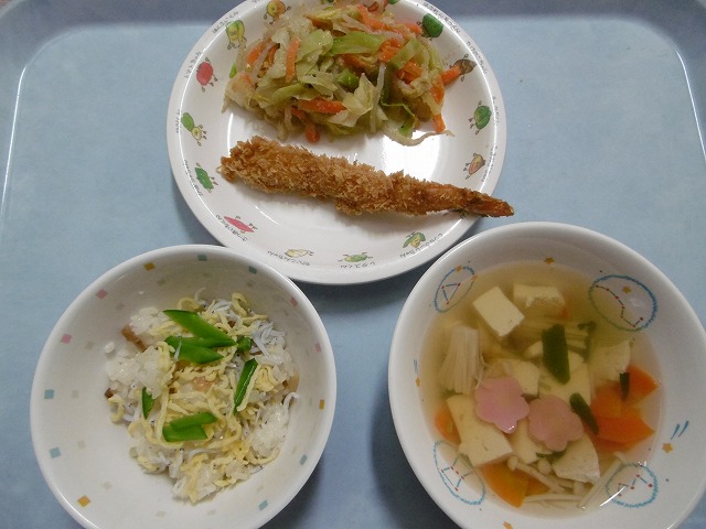 3月3日(金) 給食 ・ちらし寿司 ・えびフライ ・白菜のごまあえ ・すまし汁 ・ひなまつりゼリー